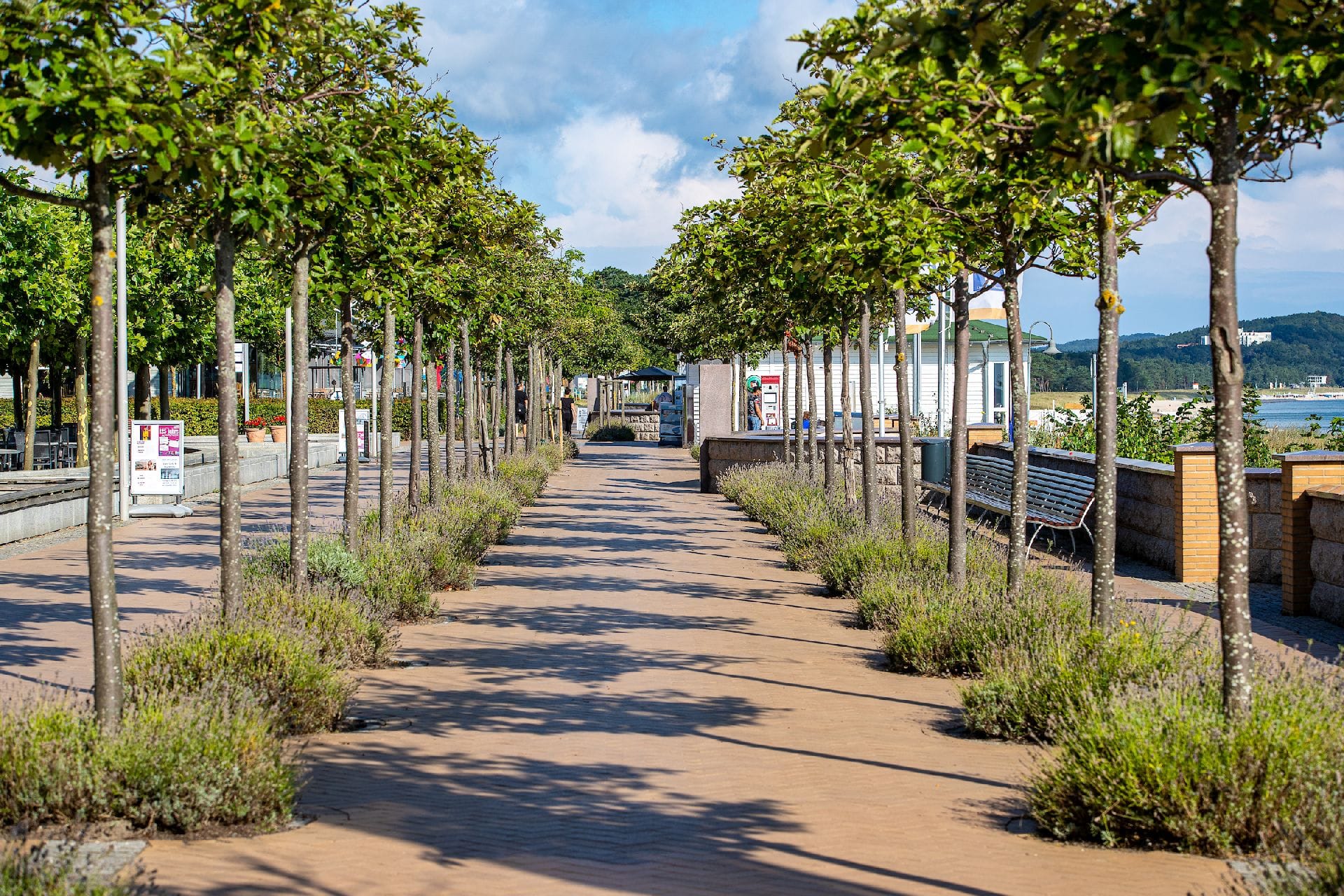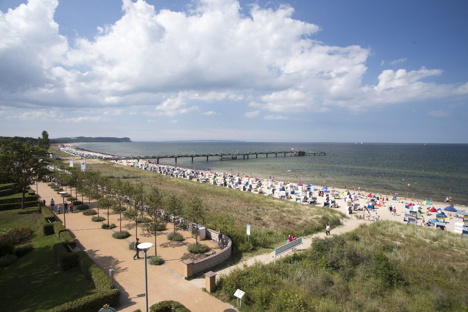 Göhrens Nordstrand wird von einer breiten Strandpromenade, der Bernsteinpromenade, gesäumt. Sie wurde anlässlich der Internationalen Garten Ausstellung (IGA) im Jahre 2003 zusammen mit Kurplatz und Musik-Pavillon neu gestaltet. Heute ist sie einer der Hauptbestandteile des touristischen Lebens von Göhren. Gemütliche Cafés, hervorragende Restaurants und ein Spielplatz für Kinder vermitteln unmittelbar am Strand und am Meer ein mediterranes Lebensgefühl. Auf dem Kurplatz, vor dem denkmalgeschützten Musik-Pavillon, finden ganzjährig zahlreiche Veranstaltungen und Konzerte statt. Live-Musik und Tanz unter freiem Himmel schaffen eine angenehme und ausgelassene Urlaubsatmosphäre, um den Alltag mal hinter sich lassen zu können. Links vom Kurplatz befindet sich die 280 Meter lange Seebrücke. Sie wurde im Jahre 1992 errichtet. Schlendern Sie hinaus auf das Meer und genießen Sie die unvergleichliche Aussicht auf die Ostsee. Von dort aus können Sie auch einen der Ausflugsdampfer besteigen und eine kleine Seereise unternehmen. Wie wäre es zum Beispiel mit einer Fahrt entlang der Kreideküste oder einen Besuch der benachbarten Seebäder?