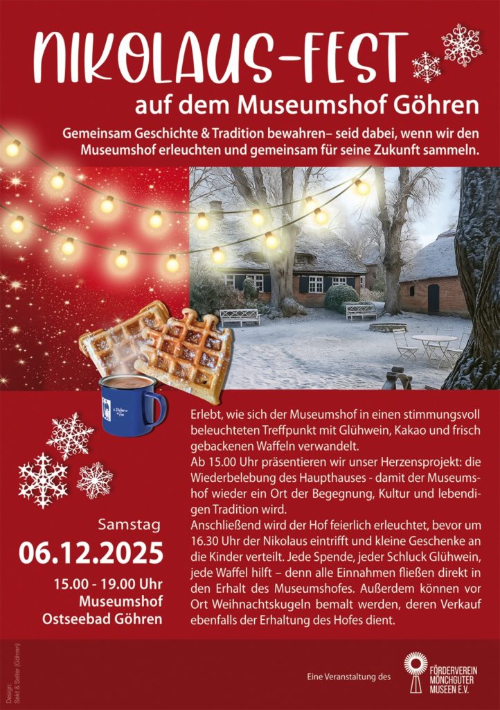 Wir möchten zudem noch auf ein besonderes Highlight hinweisen … das NIKOLAUSFEST auf dem Museumshof im Ostseebad Göhren … am 6. Dezember 2025 ab 15.00 Uhr … eine Veranstaltung des Fördervereins Mönchguter Museen e.V.