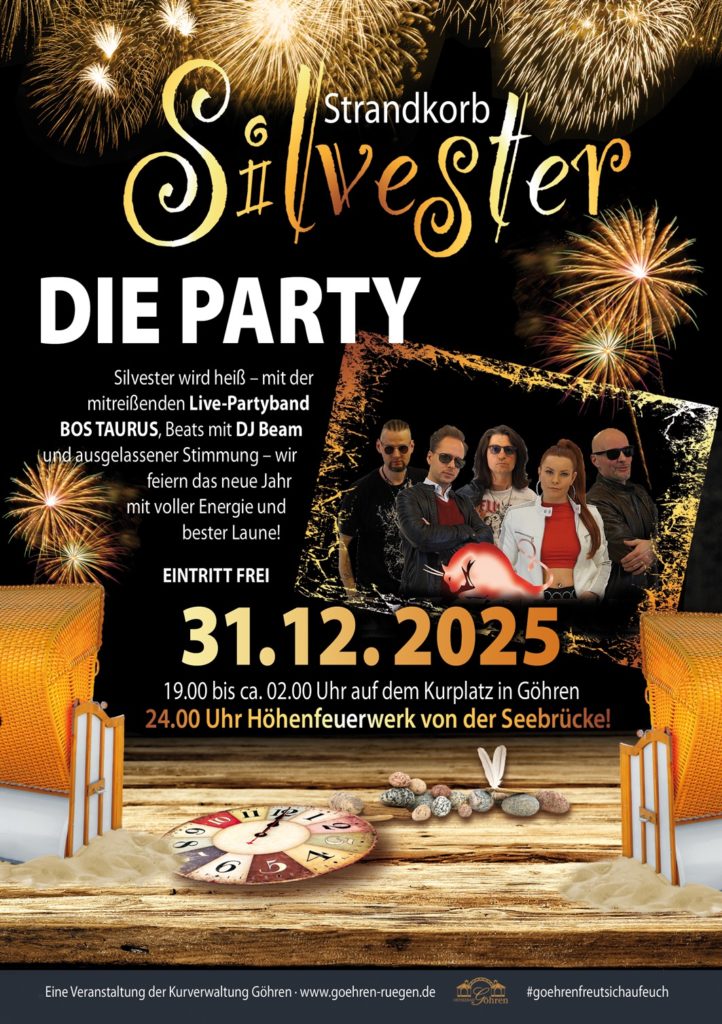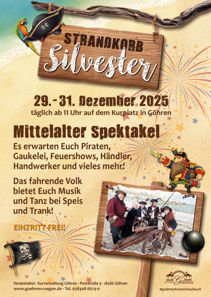 Das Ostseebad Göhren lädt Sie zu jeder Jahreszeit ein … es ist etwas ganz Besonderes, den Jahreswechsel im Ostseebad Göhren zu erleben. Feiert mit uns das schon traditionelle Strandkorbsilvester vom 29. bis 31.12.2025. Unter dem Motto „Piraten erobern Göhren“ könnt ihr täglich ab 11.00 Uhr auf dem Kurplatz und auf der Promenade Piraten, Gaukelei, Feuershows, Händler, Handwerker und vieles mehr erleben. Für Speis und Trank ist gesorgt und auch für passende Musik. In den Abendstunden finden für Interessierte Glühweinpartys statt. Am 31. 12.2025, in der Silvesternacht, könnt ihr das traditionelle Höhenfeuerwerk auf der Seebrücke erleben und mit Partymusik in das neue Jahr 2026 starten.