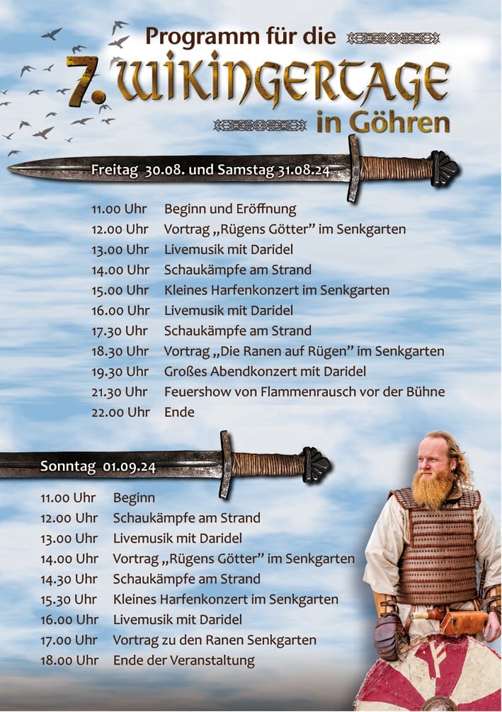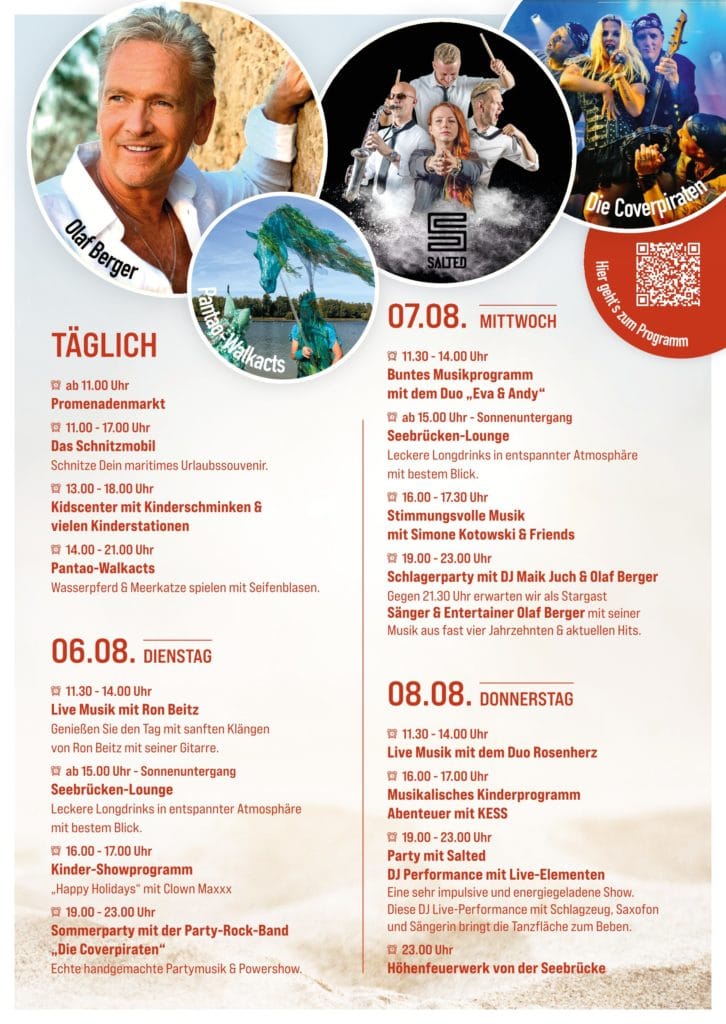 Der Sommerurlaub ist in vollem Gange und wir freuen uns sehr, dass Ihr hier bei uns seid. Wir möchten Euch wie immer ein großartiges Aktiv- und Erlebnisprogramm bieten … unter diesem Link findet Ihr eine große Auswahl … Und natürlich haben wir auch noch besondere Highlights für Euch … Die Seebrückentage vom 6. bis 8. August 2024, der Kinosommer vom 12. bis 14. August und dann natürlich auch die WIKINGERTAGE vom 30. August bis 01. September 2024 … WAS FÜR EIN PROGRAMM für EUCH …