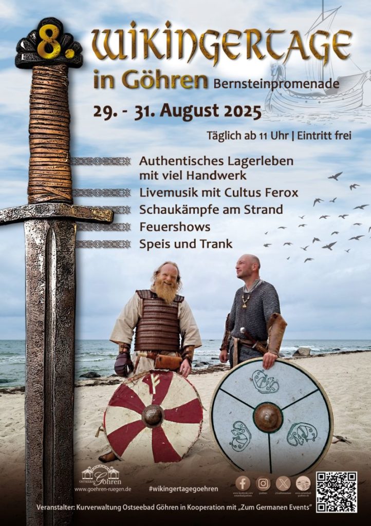 Am letzten Augustwochenende (29.08-31.08.2025) laden die Wikingertage Göhren zu einem fantastischen Spektakel ein. Hier werden Kurplatz, Nordstrand und Bernsteinpromenade zum Wikingertreff. In nur wenigen Jahren hat sich dieser große Spaß bereits einen festen Platz im Göhrener Jahreskalender erobert und findet nun zum achten Mal statt. Zahlreiche „Wikinger“ mit authentischer Kleidung und Ausrüstung schlagen ihr Lager am Strand und im Kurpark auf und zeigen dort auf anschauliche Art und Weise, wie die Wikinger und Slawen hier vor vielen hundert Jahren lebten. Für diese Darsteller ist das „Wikingerleben“ übrigens ein besonderes Hobby und in die ehrenamtliche Darstellung des Lagerlebens wird viel Zeit, Herzblut und historische Authentizität investiert. Aber es wird nicht nur das Lagerleben für Besucher zugänglich gemacht, sondern es reisen auch „Wikingerkämpfer“ an, welche ihre Waffen und Kampftechniken nach historischem Vorbild in Schaukämpfen am Strand zeigen werden. Diese Kämpfe sind übrigens nicht nur Show, sondern eine richtige Sportart mit festgelegten Regeln. Gekämpft wird nämlich mit echten Schwertern und Lanzen, allerdings nicht mit scharfen, spitzen Waffen, sondern mit speziell hergestellten Repliken. Dazu gibt es interessante mittelalterliche Handwerksvorführungen, wie zum Beispiel die Glasperlenherstellung, einen Schmied, Bronzeguss, Bernsteinbearbeitung, einen Lederer und vieles mehr. Auch für das leibliche Wohl ist bestens gesorgt mit ausgewählten Ständen in historischem Ambiente. Musikalisch wird mehrmals täglich die Band Cultus Ferox, die Urgewalt der traditionellen nordischen Musik, mit ihren Trommeln und Dudelsäcken eine Woge der Begeisterung entfesseln. Ihre Musik ist ein Tribut an die Klänge und Rhythmen vergangener Jahrhunderte, ein Vermächtnis, das sie mit Stolz und Leidenschaft weitertragen. Und als Höhepunkt gibt es Freitag- und Samstagabend jeweils eine Feuershow mit Pia Drei-Feuerherzen.